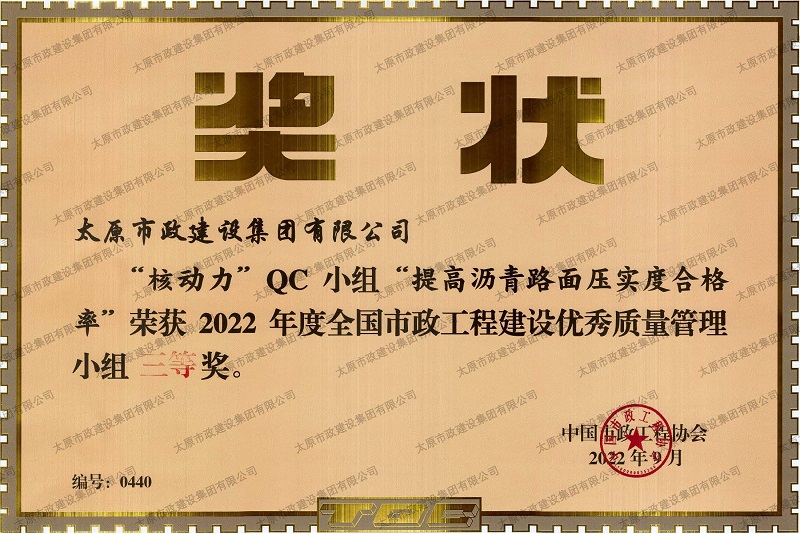 2022年度全國(guó)市政工程建設(shè)優(yōu)(yōu)秀質(zhì)量管理小組三等獎(jiǎng)_''核動(dòng)力QC小組”提高瀝青路面壓實(shí)度合格率”